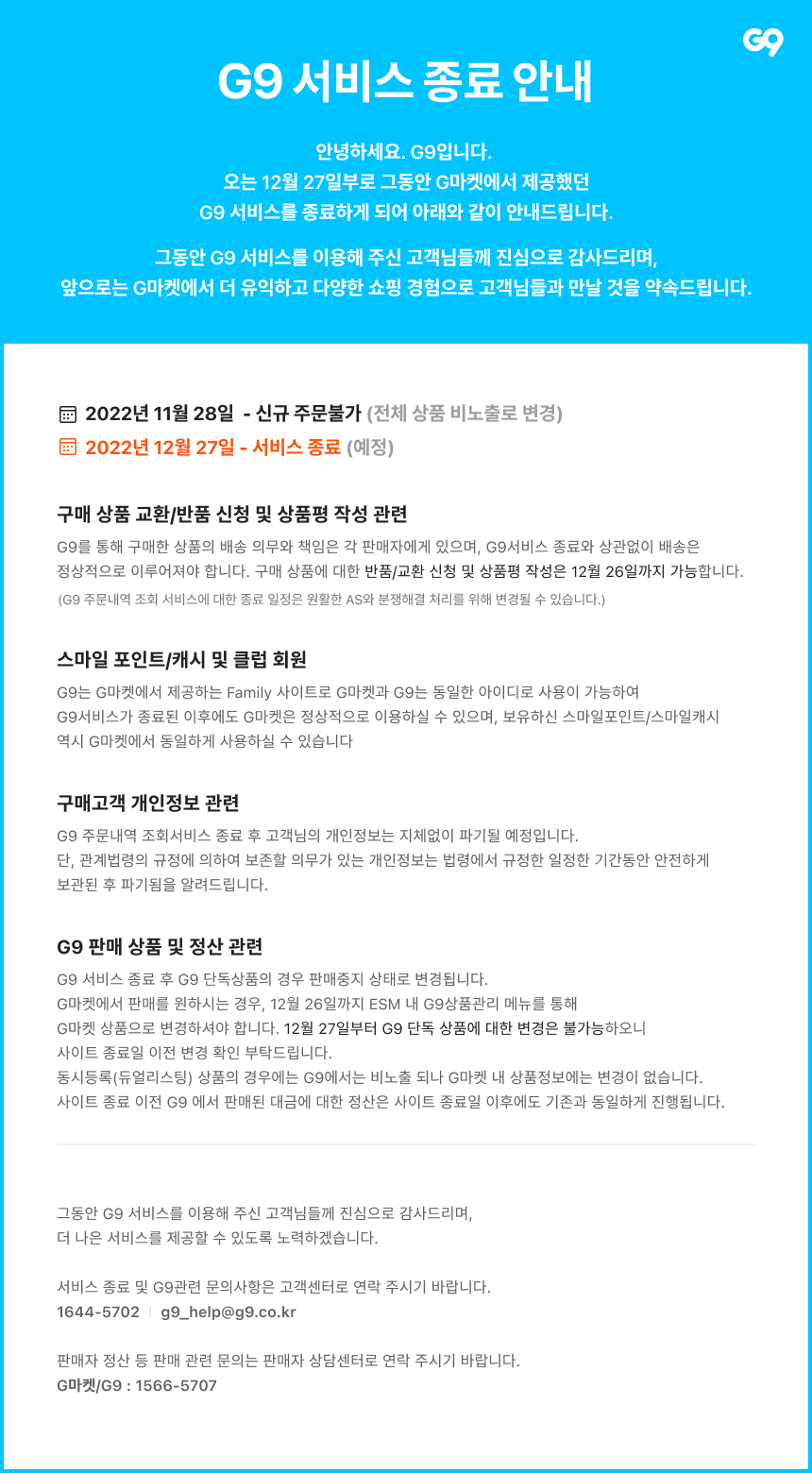 - G9 서비스 종료일시 : 12월 27일 (화)