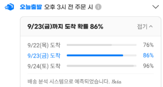 ※ 배송데이터 있는 경우 통계로 계산된 출발예정일이 노출 (결제일 기준 3일 이하 출발일만 노출)